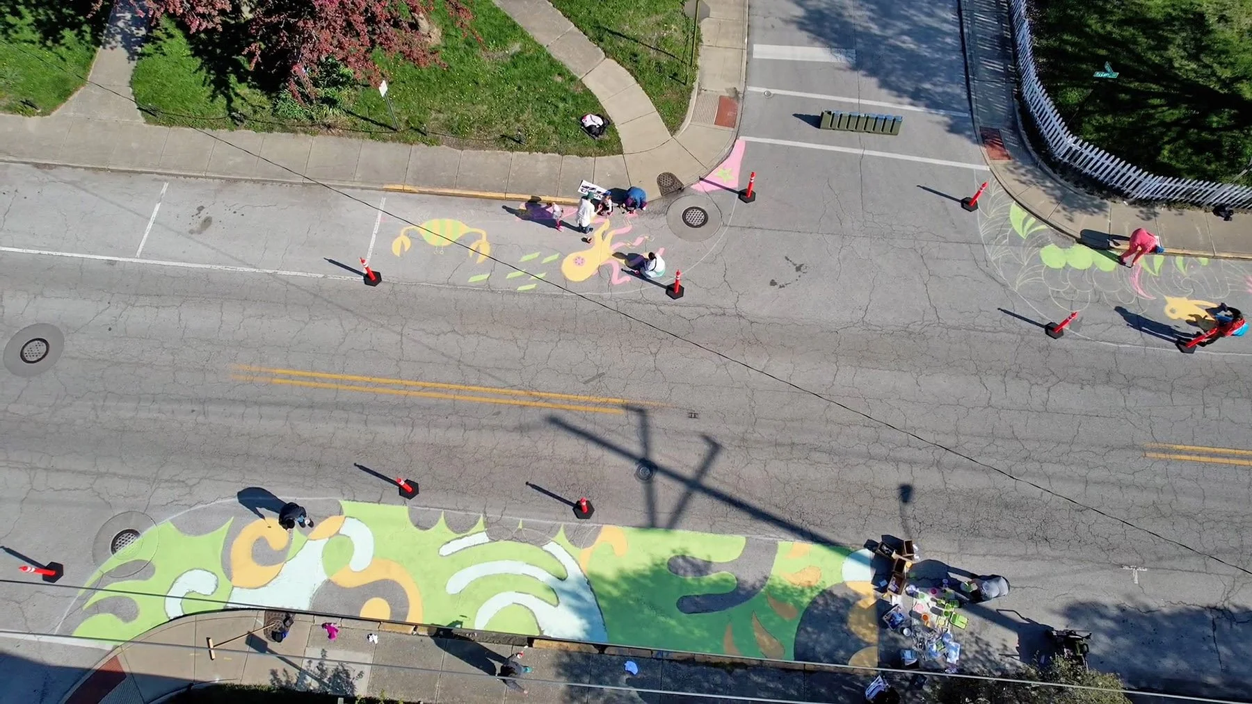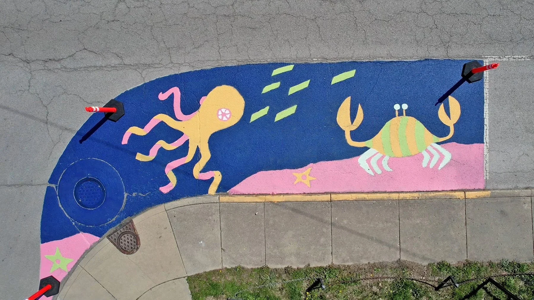 Ahead of the paint day, I drew out the designs in chalk and then painted thin lines so the volunteers would have an easy-to-follow guide. I also made several laminated color design guides. 30 volunteers came through to paint during the one-day installation. The weather was chilly but sunny and beautiful. Everyone did great!